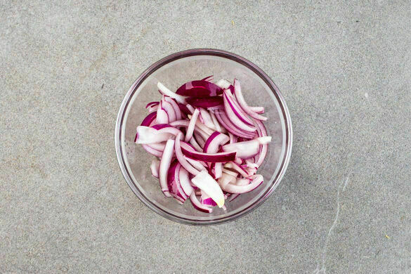 Die Zwiebel schälen, halbieren und in feine Streifen schneiden. Mit 1EL Essig und je ½TL Salz und Zucker vermengen und beiseitestellen.