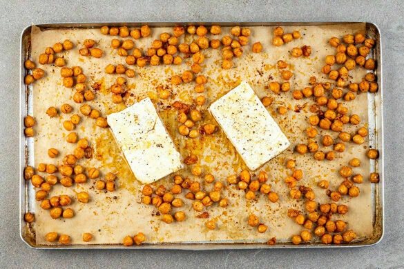 Die Fetastücke halbieren und mit insgesamt 2TL Olivenöl und 2TL Honig beträufeln. Nach Geschmack mit Pfeffer würzen, zwischen den Kichererbsen aufs Blech geben und mitbacken, bis die Kichererbsen fertig sind.