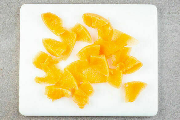Die Melonen halbieren, in Spalten schneiden und mit einem scharfen Messer die Schale entfernen. Das Fruchtfleisch in mundgerechte Stücke schneiden.