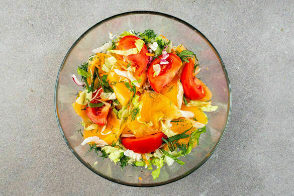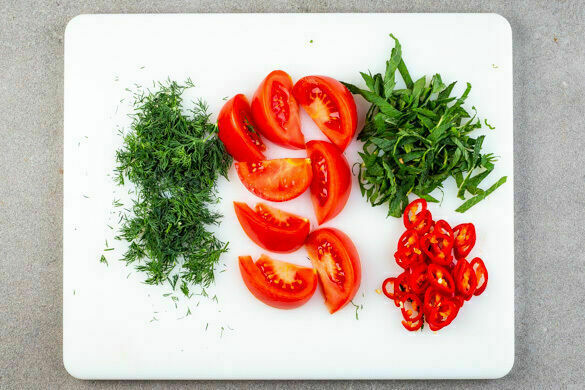Die Tomaten in Spalten schneiden, den Strunk entfernen. Den Dill samt Stängeln fein schneiden. Die Minzeblätter abzupfen und in feine Streifen schneiden. Die Peperoni in dünne Ringe oder feine Streifen schneiden. Tipp: Für weniger Schärfe die Kerne entfernen.