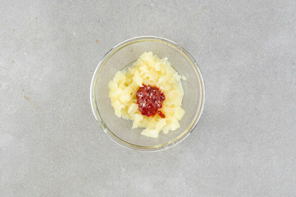 Den Backofen auf 230°C (210°C Umluft) vorheizen. In einem mittelgroßen Topf ausreichend Wasser für das Fleisch zum Kochen bringen. Die ½ der Ananas in ein Sieb abgießen, dabei den Saft auffangen. Die Ananasstücke fein hacken und mit dem Sambal Badjak, 1TL Essig und 1 Prise Salz vermengen.