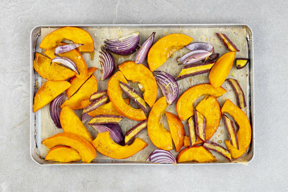 Den Kürbis, die Karotten und die Zwiebeln auf ein mit Backpapier ausgelegtes Backblech geben, mit 2EL Olivenöl sowie je 1 kräftigen Prise Salz und Pfeffer würzen und 15Min. im Ofen rösten. Den Knoblauch für die letzten 5Min. untermengen und mitbacken.