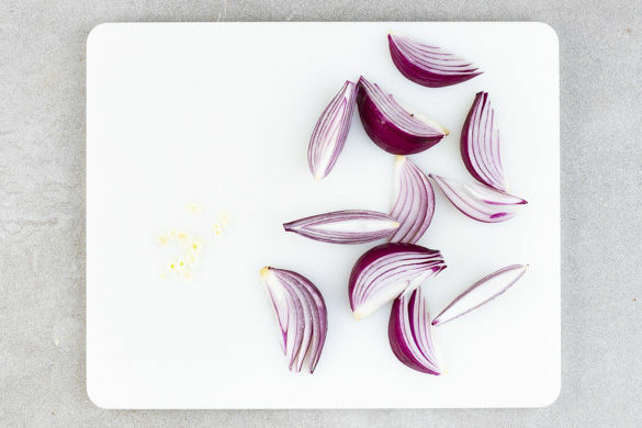 Die Zwiebel schälen, halbieren und in ca. 1cm breite Spalten schneiden. Den Knoblauch schälen und in hauchdünne Scheibchen schneiden.