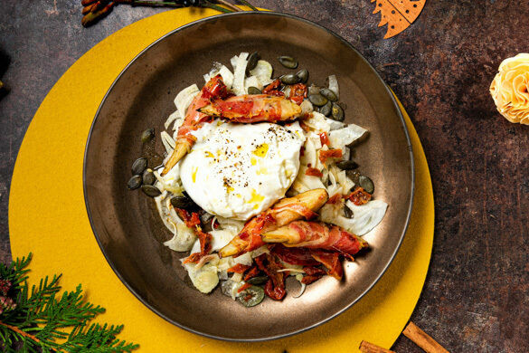 Wer die Zutaten für dieses besondere Rezept liest, schwebt jetzt schon im Gourmethimmel! Wunderschön präsentieren sich die in knusprigen Serranoschinken gewickelten Birnenspalten auf den hauchzarten Fenchelscheiben, die mit getrockneten Tomaten und Orangendressing eine delikate Symbiose eingehen. Ganz obenauf: cremige Burrata, eine unwiderstehliche Melange aus Mozzarella und Sahne. Man gönnt sich ja sonst nichts!
