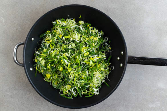 Inzwischen den Lauch jeweils längs halbieren und quer in dünne Scheiben schneiden, dann in einer großen Pfanne mit 1EL Pflanzenöl und je 1 kräftigen Prise Salz, Pfeffer und Zucker bei mittlerer bis starker Hitze in 4–5Min. weich braten.