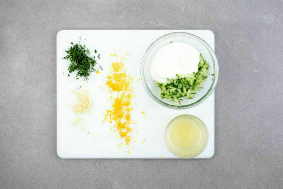 Den Knoblauch schälen und fein würfeln. ¼ der Gurke grob reiben und leicht auspressen. Den Dill samt Stängeln fein schneiden. Die Zitronenschale abreiben, dann die Zitrone auspressen. Den Joghurt mit dem Knoblauch und den Gurken verrühren und mit Zitronensaft, -schale, Salz und Dill würzen. Das Tzatziki bis zum Servieren ziehen lassen.