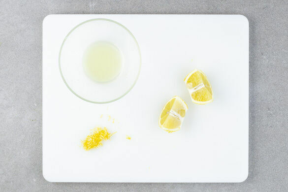 Ca. die ½ der Zitronenschale abreiben, dann die Zitrone halbieren und eine Hälfte auspressen, die andere Hälfte in Spalten schneiden.
