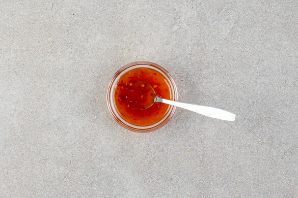 Die Sweet-Chili-Sauce mit 2EL Essig und 2EL Wasser verrühren. Die Garnelen auf dem Bohnen-Orangen-Salat anrichten und mit dem Sweet-Chili-Dip servieren.