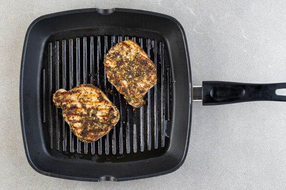 Das Fleisch trocken tupfen und mit der ½ der Gewürzmischung, 1EL Olivenöl, 1EL Essig und 1 Prise Salz einreiben. Das Fleisch in einer Grillpfanne oder einer mittelgroßen Pfanne bei mittlerer bis starker Hitze auf jeder Seite 2–3Min. anbraten. Anschließend aus der Pfanne nehmen und in Streifen schneiden.