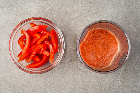 Die Tomaten vierteln, den Strunk entfernen und das Kerngehäuse herausschneiden. Das Kerngehäuse der Tomaten in einem hohen Gefäß mit einem Stabmixer pürieren und mit je 1 Prise Salz und Pfeffer würzen. Das Tomatenfruchtfleisch in Streifen schneiden.