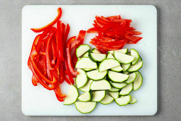 Die Zucchini längs halbieren und quer in dünne Scheiben schneiden. Die Paprika vierteln, entkernen und in dünne Streifen schneiden. Die Tomaten vierteln, dabei die Kerne entfernen und das Fruchtfleisch in dünne Streifen schneiden.