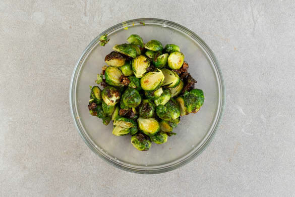Die Zwiebel schälen und fein würfeln. Den Rosenkohl halbieren, auf einem mit Backpapier ausgelegten Backblech mit 1EL Pflanzenöl und je 1 Prise Salz, Pfeffer und Zucker vermengen und im Ofen in 10–12Min. knusprig rösten.