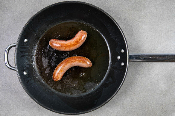 Die Würste in einer zweiten Pfanne mit 1EL Olivenöl bei starker Hitze auf jeder Seite ca. 1Min. knusprig anbraten. Die Hitze reduzieren und die Würste weitere 4–5Min. auf jeder Seite braten, bis sie gar sind.