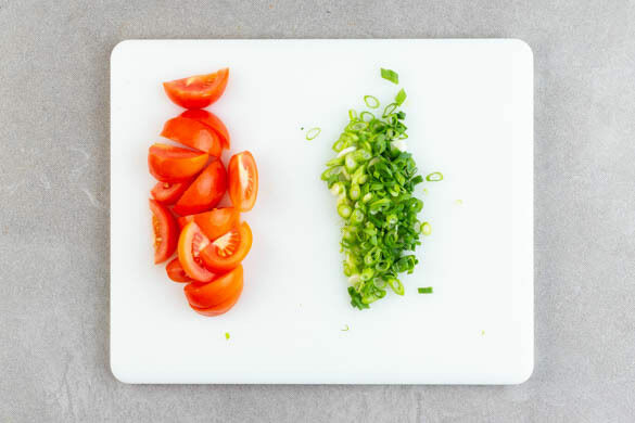 Die Tomaten in dünne Spalten, die Lauchzwiebeln in feine Ringe schneiden.