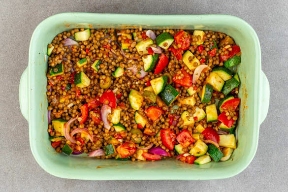 Die Auberginen-Oliven-Sauce mit den Linsen, den Tomaten, dem Knoblauch und der ½ des Thymians in die Auflaufform geben und mit den Zwiebeln und den Zucchini vermengen.