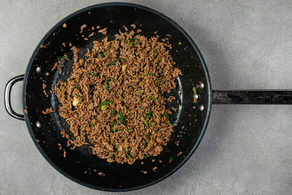 Etwas Lauchzwiebelgrün für die Garnitur beiseitelegen. Die übrigen Lauchzwiebeln, den Ingwer, den Knoblauch und die Chiliflocken nach Geschmack in einer großen Pfanne oder einem Wok mit 2EL Pflanzenöl bei starker Hitze ca. 1Min. anbraten. Das Hackfleisch hinzufügen und 2–3Min. mitbraten, bis es braun und ein Großteil der Flüssigkeit verdampft ist.