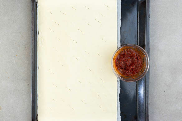Das Tomatenmark mit der Gewürzmischung, 1EL Olivenöl, 2EL Wasser sowie je 1 kräftigen Prise Salz und Pfeffer zu einer Sauce verrühren. Den Teig mit dem Papier nach unten auf einem Backblech ausrollen und mit einer Gabel mehrere Male einstechen.