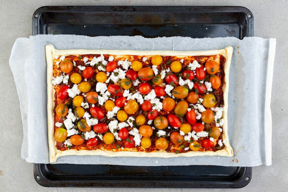 Die Sauce gleichmäßig auf den Teigen verteilen, dabei ca. 2cm Rand auslassen. Den Rand leicht eindrehen, um eine Kruste zu bilden. Die Teige mit den Zwiebeln und den Kirschtomaten belegen, dann mit der ½ der Kapern bestreuen und den Feta darüber zerkrümeln. Mit der Basilikumcreme beträufeln und mit je 1 Prise Pfeffer würzen.