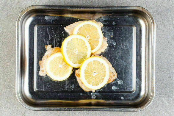 Den Backofen auf 220°C (200°C Umluft) vorheizen. Den Lauch längs halbieren und quer in feine Streifen schneiden. Die Zucchini längs halbieren und quer in dünne Scheiben schneiden. Die Zitrone ebenfalls in dünne Scheiben schneiden, evtl. vorhandene Kerne entfernen.