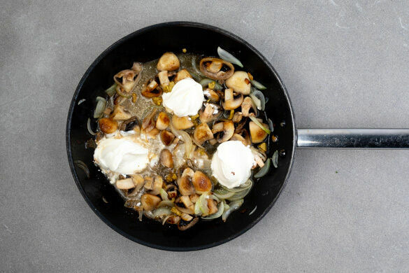 Die Pilze in derselben Pfanne mit 1EL Olivenöl bei mittlerer Hitze 3–5Min. anbraten. Die Zwiebeln hinzufügen und 1–2Min. mitbraten. 1EL Mehl unterrühren und mit 200–300ml Wasser ablöschen. Die ½ des Brühgewürzes in der Sauce auflösen, dann die Crème fraîche und das Fleisch hinzugeben und das Geschnetzelte 1–2Min. köcheln lassen.