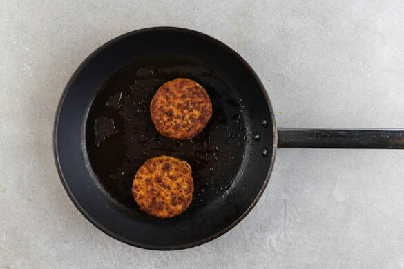 Die Schnitzel in einer mittelgroßen Pfanne mit 1EL Pflanzenöl bei mittlerer Hitze auf jeder Seite 3–4Min. goldbraun anbraten.