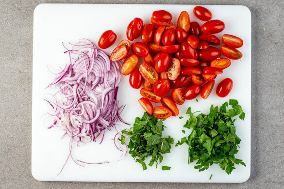 Die Zwiebel schälen, halbieren und in feine Streifen schneiden. Die Kirschtomaten halbieren. Die Zwiebeln in der Pfanne mit 1EL Olivenöl bei mittlerer Hitze 2–3Min. glasig anschwitzen. Die Minzeblätter von den Stängeln zupfen und grob schneiden. Die Petersilienblätter grob, und die Stängel fein schneiden.