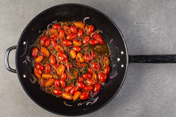 Die Tomaten, die ½ des Brühgewürzes und 100ml Wasser in die Pfanne geben und dann 2–3Min. abgedeckt köcheln lassen, bis die Tomaten weich sind. Die Tomaten mit einem Kochlöffel zerdrücken und alles 2–3Min. ohne Deckel köcheln lassen. Mit 2EL Balsamicoessig und 1 Prise Pfeffer würzen. Ggf. mehr Essig, Pfeffer und Wasser zufügen.