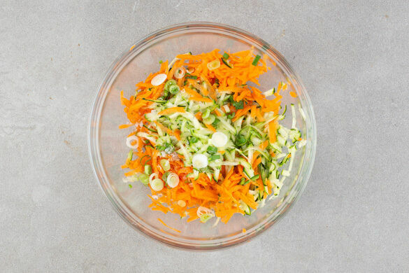 Inzwischen die Karotten ggf. schälen und mit einer Küchenreibe grob raspeln. Die Zucchini ebenfalls grob reiben. Die Lauchzwiebeln in dünne Ringe schneiden und mit den Karotten, den Zucchini, 1EL Essig und ½TL Salz mischen.