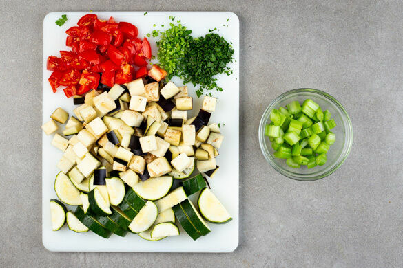 Den Backofen auf 240°C (220°C Umluft) vorheizen. Die Auberginen in ca. 1cm große Würfel schneiden. Die Zucchini längs halbieren und dann quer in dünne Scheiben schneiden. Den Stangensellerie in dünne Scheiben oder kleine Würfel schneiden. Die Tomaten in ca. 1cm große Würfel schneiden. Die Petersilienblätter und -stängel separat fein schneiden.