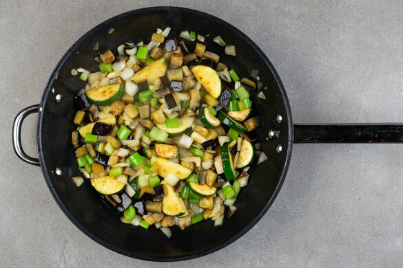 Die Auberginen, die Zucchini und den Stangensellerie in einer großen Pfanne mit 2EL Olivenöl bei mittlerer Hitze ca. 5Min. anbraten, bis die Auberginen leicht gebräunt sind. Die Zwiebel und den Knoblauch schälen, grob würfeln und ca. 3Min. mitbraten.