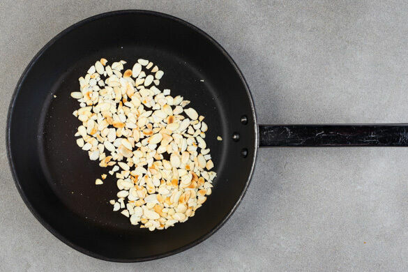 Die Mandeln in einer kleinen Pfanne ohne Zugabe von Fett bei mittlerer Hitze 1–2Min. goldbraun anrösten. Vorsicht, sie können schnell zu dunkel werden. Zum Abkühlen aus der Pfanne nehmen und beiseitestellen.