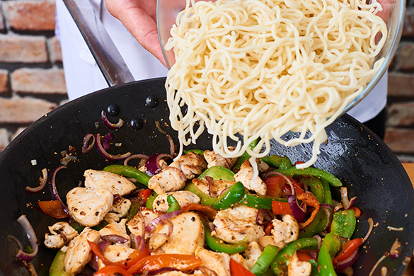 Die Nudeln zum Gemüse und Fleisch in die Pfanne geben und alles gut miteinander vermengen, dabei ggf. etwas Kochwasser zugeben. Die Bratnudeln kurz durchwärmen, mit Salz und Pfeffer abschmecken und auf Teller verteilen. Mit dem aufbewahrten Lauchzwiebelgrün garniert servieren.