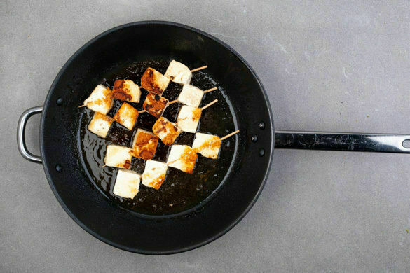 Den Grillkäse in ca. 2cm große Würfel schneiden. Die Käsewürfel auf 8 Schaschlikspieße ziehen und in einer großen beschichteten Pfanne mit 2EL Olivenöl bei starker Hitze auf jeder Seite ca. 1Min. anbraten. Es sollten deutliche Röstspuren zu sehen sein. Je nach Größe der Pfanne ggf. in zwei Durchgängen arbeiten oder eine zweite Pfanne verwenden.