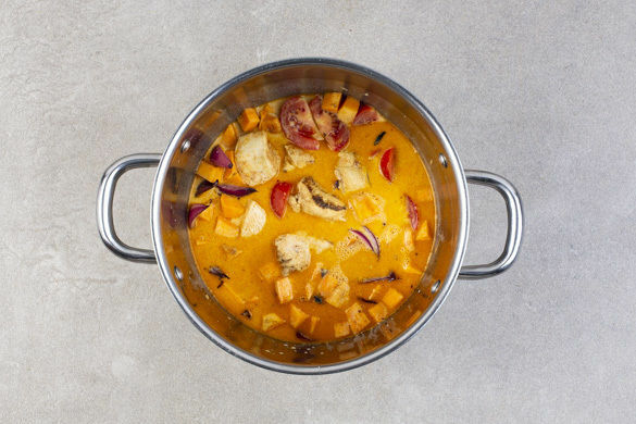 Die Zwiebeln in einem weiteren mittelgroßen Topf mit 1EL Pflanzenöl bei mittlerer Hitze 1–2Min. anbraten. Den Ingwer und das Fleisch samt Marinade hinzugeben und 3–5Min. anbraten. Die Tomaten und die Süßkartoffeln unterrühren und 1–2Min. mitbraten. Mit der Kokosmilch ablöschen.