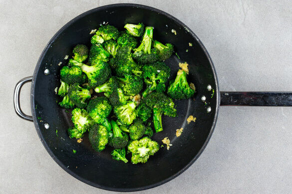 Den Brokkoli, den Knoblauch und den Ingwer in einer großen Pfanne mit 2EL Pflanzenöl bei mittlerer bis starker Hitze unter häufigem Rühren ca. 2Min. anbraten. Mit der ½ der restlichen Sojasauce und 4–6EL Wasser ablöschen, mit je 1 Prise Salz und Pfeffer würzen und den Brokkoli bei mittlerer Hitze 5–6Min. garen. Bis zum Servieren abgedeckt warm halten.