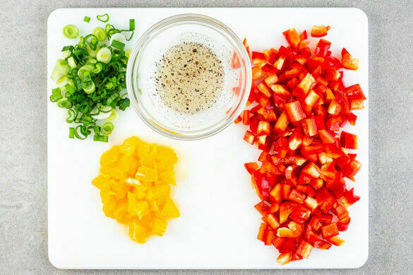 Die Paprika vierteln, entkernen und in kleine Würfel schneiden. Die Orangen so schälen, dass auch die weiße Haut entfernt wird, und das Fruchtfleisch ebenfalls in kleine Würfel schneiden. Die Lauchzwiebeln in dünne Ringe schneiden, dann mit der Paprika, den Orangenwürfeln, 4EL hellem Essig sowie je 1 Prise Salz, Pfeffer und Zucker vermengen.