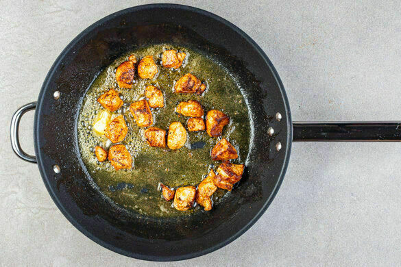 Das Fleisch in einer großen Pfanne mit 2EL Butter oder Olivenöl bei mittlerer bis starker Hitze 4–5Min. rundum anbraten, bis es goldbraun und gar ist. Den Tomaten-Oliven-Reis auf Teller verteilen, das Fleisch darauf anrichten und mit der Paprika-Orangen-Salsa garniert servieren.