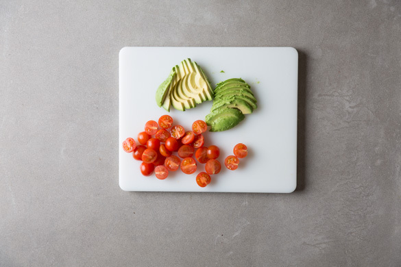Die Avocados halbieren und die Kerne entfernen. Das Avocadofruchtfleisch mit einem Löffel aus der Schale lösen und in feine Scheiben schneiden. Die Kirschtomaten halbieren.