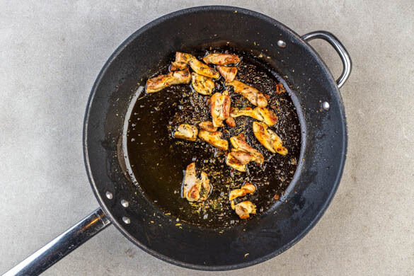 Inzwischen das Fleisch in einer großen Pfanne ohne zusätzliches Fett bei starker Hitze 3–4Min. anbraten, dann auf einem Teller beiseitestellen.