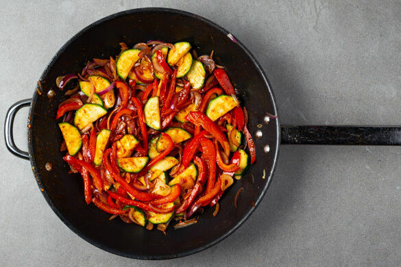 Die Zwiebeln, die Zucchini und die Paprika in einer großen Pfanne mit 1EL Olivenöl bei starker Hitze 3–4Min. anbraten. Dann den restlichen Knoblauch, die Tomaten und 1EL Ketchup hinzufügen. Ca. 3Min. braten, bis das Gemüse gar, aber noch bissfest ist. Mit der Gewürzmischung und je 1 kräftigen Prise Salz und Pfeffer abschmecken.
