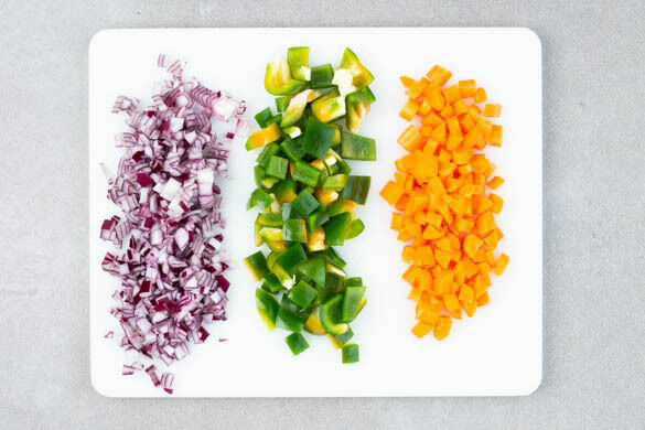 Die Süßkartoffeln schälen und in 0,5–1cm große Würfel schneiden. Die Paprika vierteln, entkernen und in ca. 1cm große Würfel schneiden. Die Zwiebel schälen, halbieren und fein würfeln.