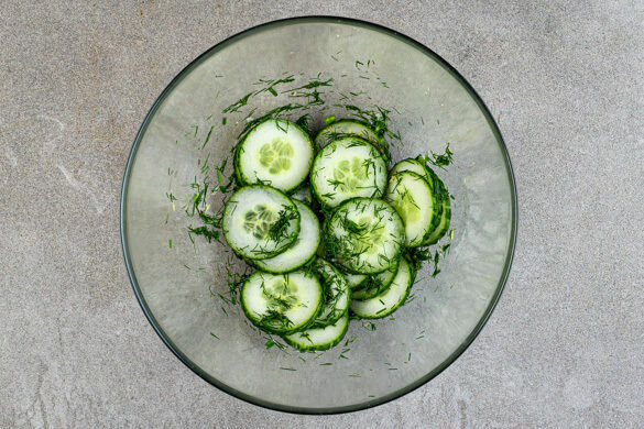 Die Gurke in dünne Scheiben schneiden. Den Dill fein schneiden. Die Zitronenschalen abreiben, dann die Zitronen halbieren und auspressen. Die Gurke mit dem Dill, der Zitronenschale und der ½ des Zitronensaftes vermengen. Den Salat mit Salz und Pfeffer abschmecken.