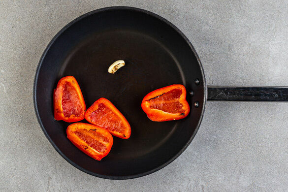 Die Paprika vierteln und entkernen. Den Knoblauch schälen und mit den Paprikastreifen in einer großen Pfanne ohne Zugabe von Fett bei starker Hitze 2–3Min. scharf von allen Seiten anbraten, bis sich leichte Röstspuren abzeichnen. Den Knoblauch aus der Pfanne nehmen, 3–4EL Wasser angießen und die Paprika abgedeckt ca. 2Min. weitergaren, bis sie weich ist.