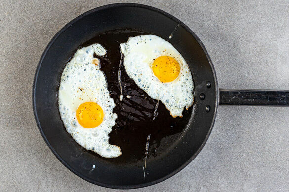 In derselben Pfanne 2EL Pflanzenöl bei mittlerer Hitze erwärmen. Die Eier aufbrechen, in die Pfanne gleiten lassen und in 3–4Min. zu Spiegeleiern braten. Mit Salz und Pfeffer würzen. Tipp: Wer möchte, dass auch das Eigelb fest wird, verwendet einen Deckel.