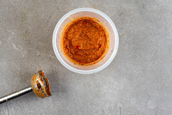 Die ½ der Paprika mit dem Knoblauch, den getrockneten Tomaten, dem restlichen Zitronensaft und 1EL Mayonnaise in einem hohen Gefäß mit einem Stabmixer möglichst fein pürieren. Die restlichen Paprikaviertel in dünne Streifen schneiden. Die Pfanne auswischen.