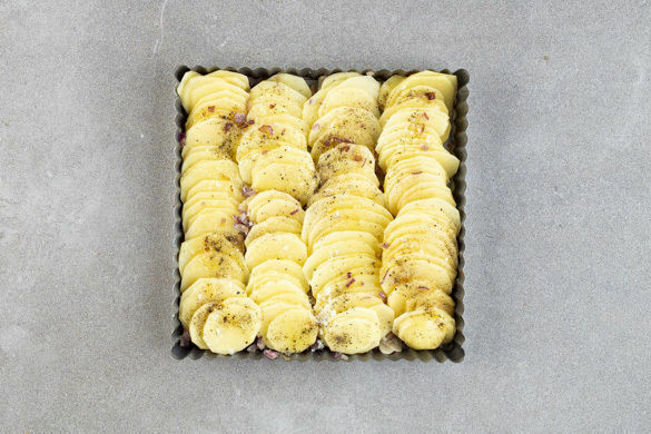 Die Kartoffeln schälen und in sehr dünne Scheiben schneiden oder hobeln.