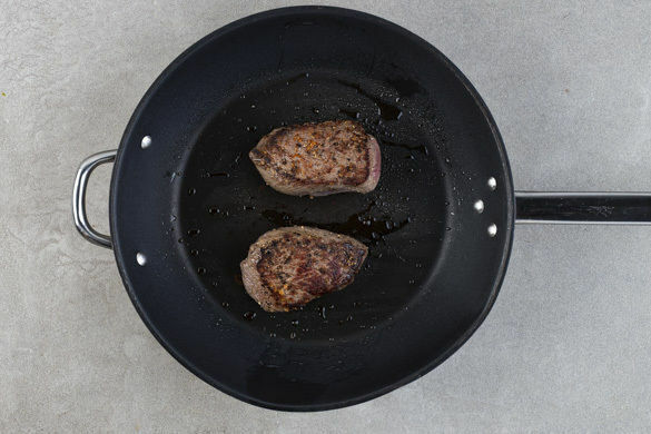 Das Fleisch trocken tupfen und mit Salz und Pfeffer würzen. In einer großen, ofenfesten Pfanne mit 2EL Olivenöl bei starker Hitze auf jeder Seite ca. 1Min. scharf anbraten, dann im Ofen 5–6Min. garen, bis das Fleisch medium durch ist. Tipp: Wer keine ofenfeste Pfanne hat, gibt das Fleisch nach dem Anbraten einfach in eine kleine Auflaufform.