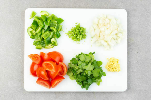 In einem kleinen Topf 300ml leicht gesalzenes Wasser für den Bulgur zum Kochen bringen. Die Zwiebel schälen und fein würfeln. Den Ingwer schälen und fein reiben. Die Paprika vierteln, entkernen und in 1–2cm große Stücke schneiden. Die Tomaten in Spalten schneiden. Die Korianderblätter grob und die Stängel fein schneiden.