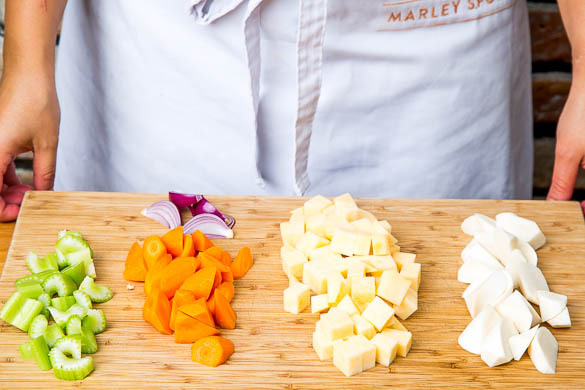 Petersilienwurzel, Steckrübe und Karotten schälen und in ca. 1–2cm große Stücke schneiden. Den Stangensellerie ebenfalls in ca. 1–2cm große Stücke schneiden. Die Zwiebel schälen und halbieren, eine Hälfte in ca. 1cm dicke Spalten schneiden, die andere Hälfte beiseitestellen.