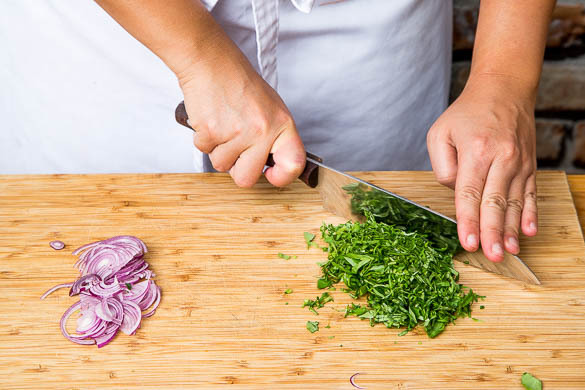 Die restliche Zwiebelhälfte und das Basilikum möglichst fein hacken und unter die Kräuterpaste mischen.